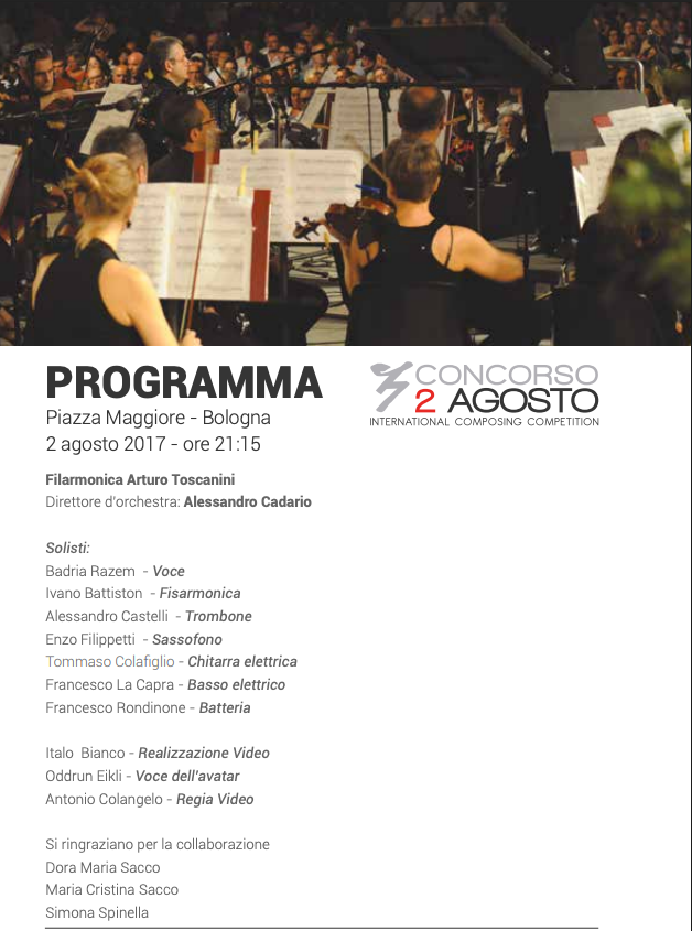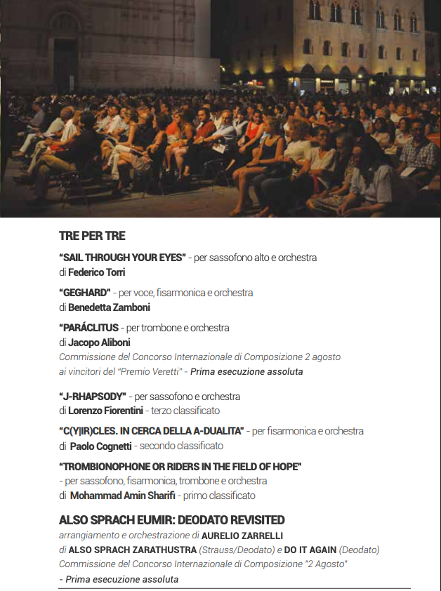 The XXIII Edition of the International Composing Competition “2 Agosto” is dedicated to scores for solo accordion, and/or saxophone, and/or trombone and orchestra.